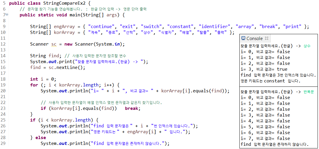 25라인 i<korArray.length는 문자열을 찾았다는 것을 의미한다. (못 찾았다면 i=korArray.length로 for문 종료)
