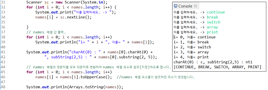 41, 42라인 names[0]의 0번 자리 문자(charAt(0))와 2~4번자리 문자열(subString(2,5))를 출력한다.