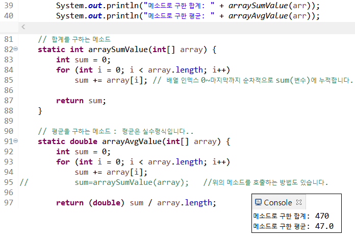 91라인 반환값은 double형, 인자는 int형 배열인 arrayAvgValue() 메소드를 선언한다.