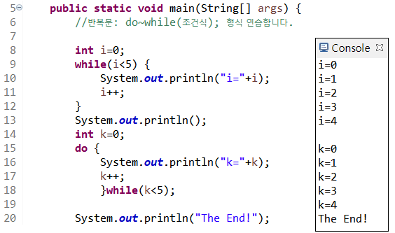 do-while문: 조건식이 k<5일 때 실행문이 5번 실행된다.