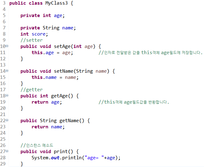 10라인 int형 필드 age 값을 받아 저장하는 setAge( )를 선언한다.