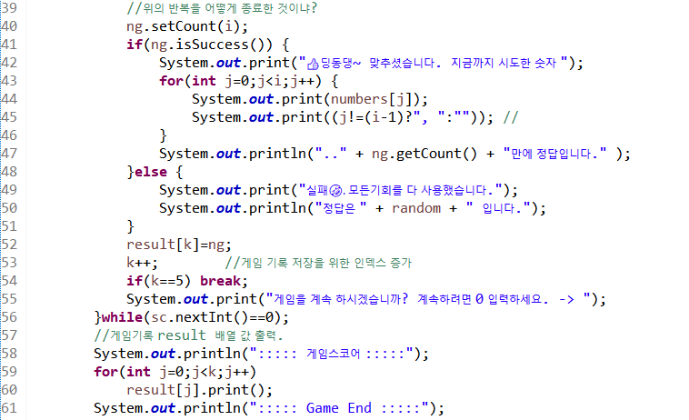 41~44라인 정답을 맞췄다면 지금까지 시도한 숫자들을 출력한다.