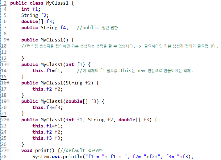 커스텀 생성자: 필드값 초기화를 위해서 인자가 있는 형식의 생성자 ex.) MyClass1(int f1)