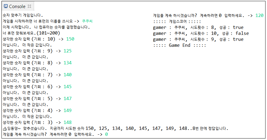 47라인 정답을 맞추기 까지 시도한 횟수를 getter 메소드를 이용하여 출력한다.