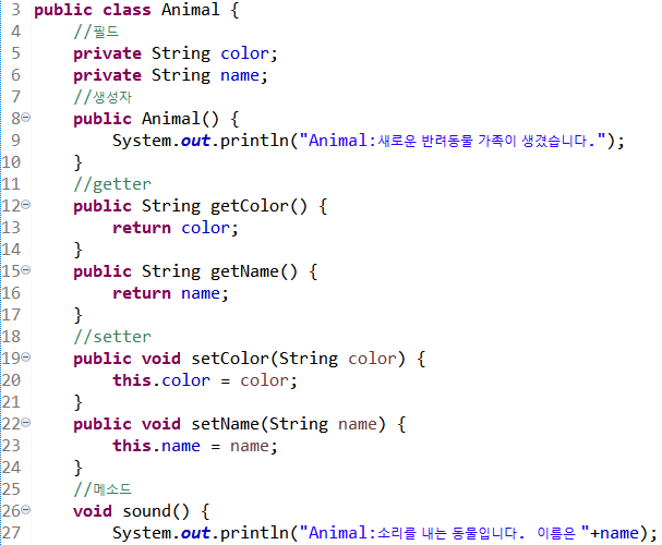 5~6라인 private 접근 제한을 갖는 필드 color, name을 선언한다.
