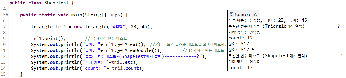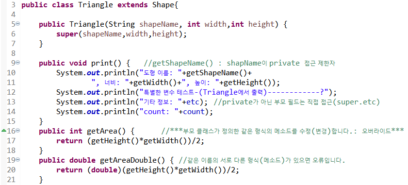 16라인 부모 클래스에서 정의한 넓이를 구하는 getArea() 메소드를 삼각형의 넓이 공식으로 재정의(오버라이드)한다.