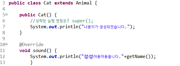 11~12라인 Animal 클래스의 sound() 메소드를 재정의(오버라이드)한다.