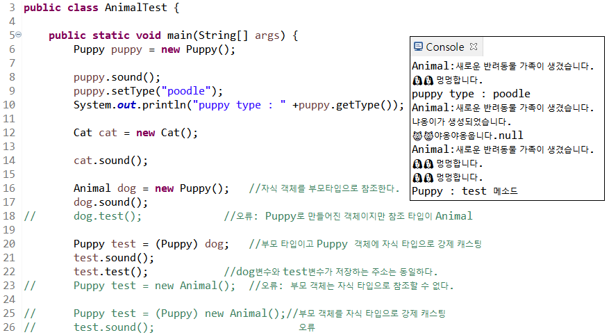 20라인 Animal 참조 타입의 dog를 (Puppy)로 강제 캐스팅한다.