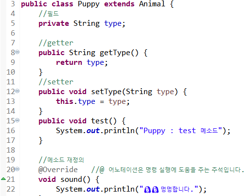 20~22라인 Animal 클래스의 sound()를 재정의(오버라이드)한다.