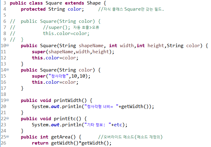 25라인 getArea() 메소드를 재정의한다.(오버라이드)