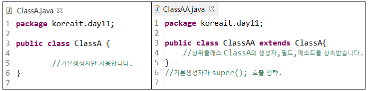 자식 클래스(ClassB)에서 기본 생성자를 사용하려면 부모 클래스(ClassA)에 기본 생성자가 있어야 한다.