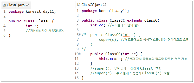 8~10라인(오른쪽) 부모 클래스(ClassA)에 기본 생성자가 없다면 자식 클래스(ClassB)에서 기본 생성자를 사용할 수 없다.