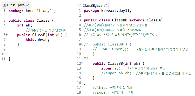 부모 클래스(ClassA)에 커스텀 생성자가 있다면 자식 클래스(ClassB)에서 같은 형식의 커스텀 생성자를 사용할 수 있다.