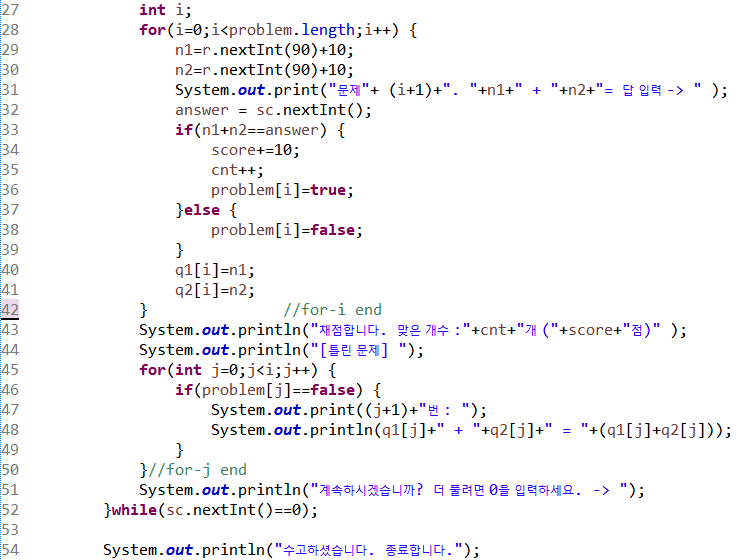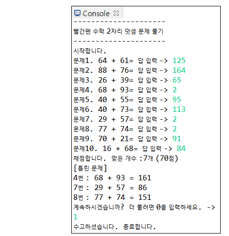 52라인 사용자가 0을 입력하면 while문을 반복하여 다시 문제를 낸다. 다른 입력을 받으면 반복을 종료한다.