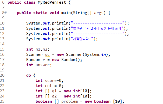 23,24라인 틀린 문제를 다시 보여주기 위해 난수를 저장할 배열 q1, q2를 선언하고 길이를 10으로 한다.