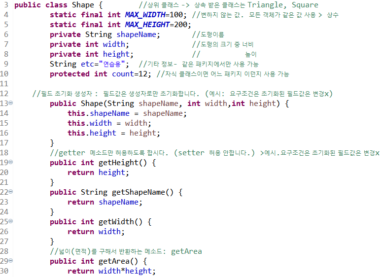 6~8라인 private 접근 제한을 갖는 필드 shapeName, width, height를 선언한다.