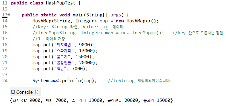 24라인 map 변수를 출력하면 데이터가 출력된다(toString 재정의)