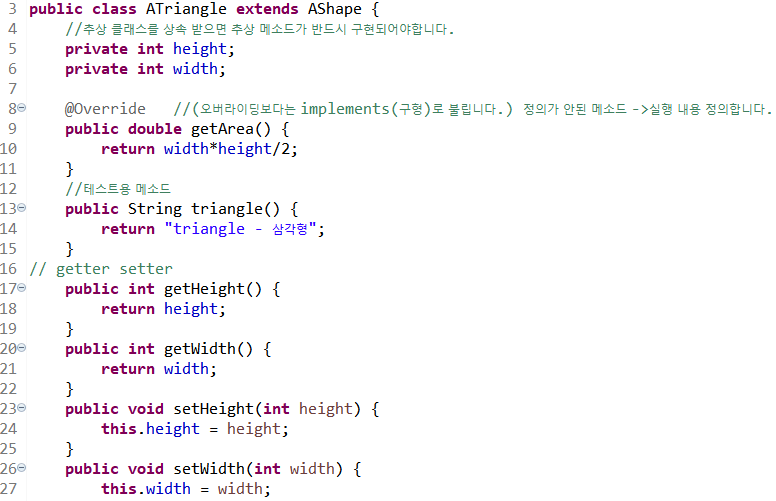 19라인 atri 변수는 ATriangle 타입이므로 triangle() 메소드를 실행할 수 있다.