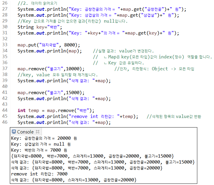 44라인 remove(key) 메소드로 키값 만으로도 값을 제거할 수 있다.