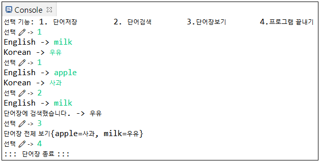 문제: 영한 단어사전을 Map을 이용하여 구현합니다.*실행화면*