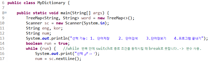 14라인 switch문에서 while문 종료 조건을 넣기 위해 변수 run을 true로 선언한다.