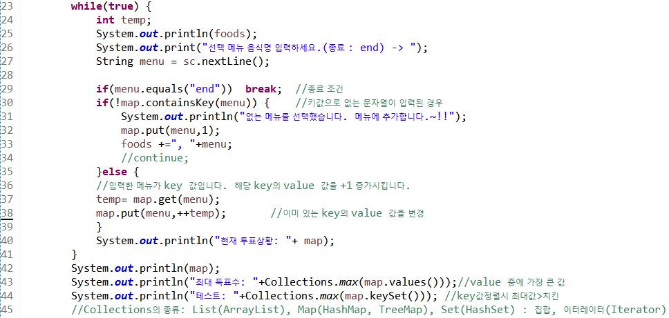 43라인 Collerctions.max(map.values()) 메소드는 vaule중에 가장 큰 값을 반환한다. 여기서는 최대 득표수를 반환한다.