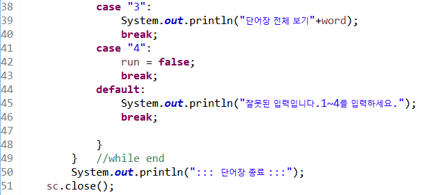 38라인 3을 입력 받으면 저장된 word를 출력한다.