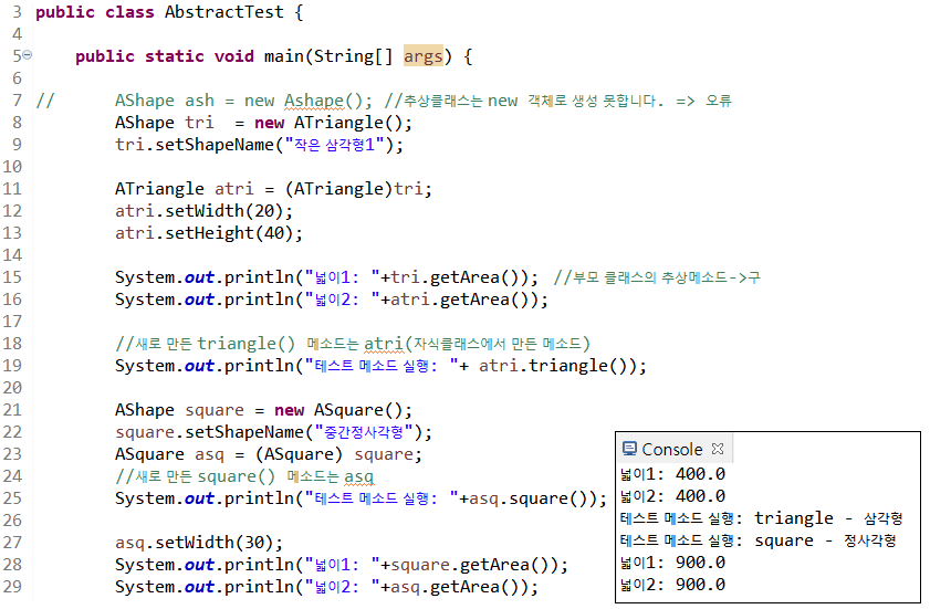 7라인 추상 클래스 AShape는 new 객체로 생성할 수 없다.