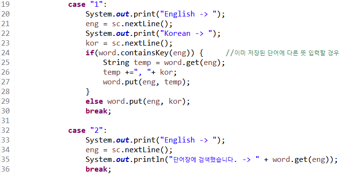 19~23라인 영어 입력 값을 변수 eng에 한글 입력 값을 변수 kor에 저장한다.