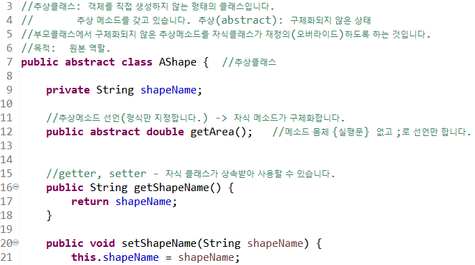 7라인 추상 클래스 선언 시 abstract 키워드를 작성한다