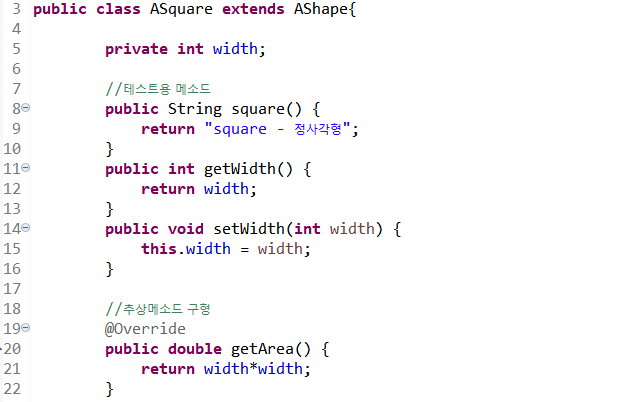 8라인 ASquare 클래스에만 있는 square() 메소드를 선언한다.