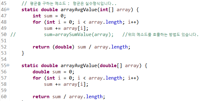 55라인 arrayAvgValue() 메소드는 double타입 배열 인자를 받아 평균값을 double타입으로 반환한다.(오버로딩)