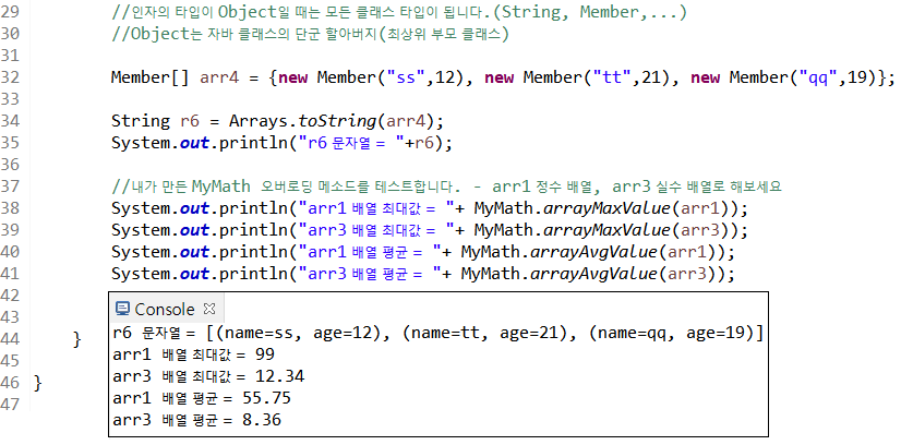 39라인 MyMath 클래스의 arrayMaxValue() 메소드로 실수 배열인 arr3의 최대값을 실수 값으로 반환한다.