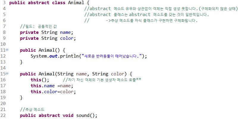 10,11라인 커스텀 생성자를 선언하고, Animal 클래스의 생성자 메소드를 호출한다.