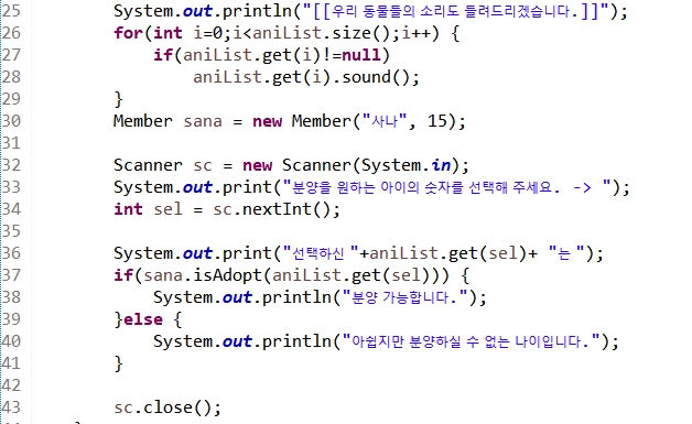 39~41라인 Scanner 클래스로 원하는 동물의 번호를 입력 받는다.