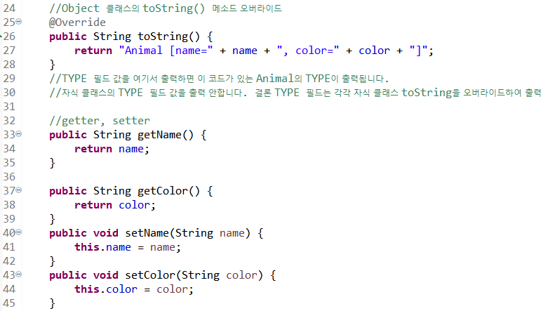 각 클래스에 해당하는 TYPE 필드값을 출력하고 싶을 경우, Animal 클래스의 toString() 메소드에 TYPE 출력문을 작성하지 않고, 각각의 자식 클래스에서 toString() 메소드를 오버라이드하여 출력한다.