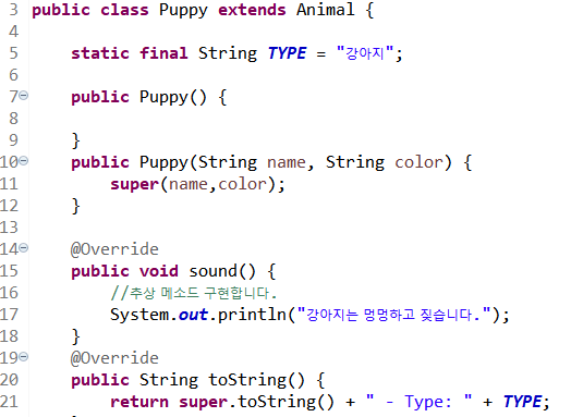 21라인 super 키워드로 Animal의 toString() 메소드를 호출하고 TYPE 필드 출력문을 추가한다.