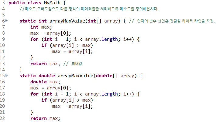 15라인 arrayMaxValue() 메소드는 double타입 배열 인자를 받아 최대값을 double타입으로 반환할 수도 있다.(오버로딩)