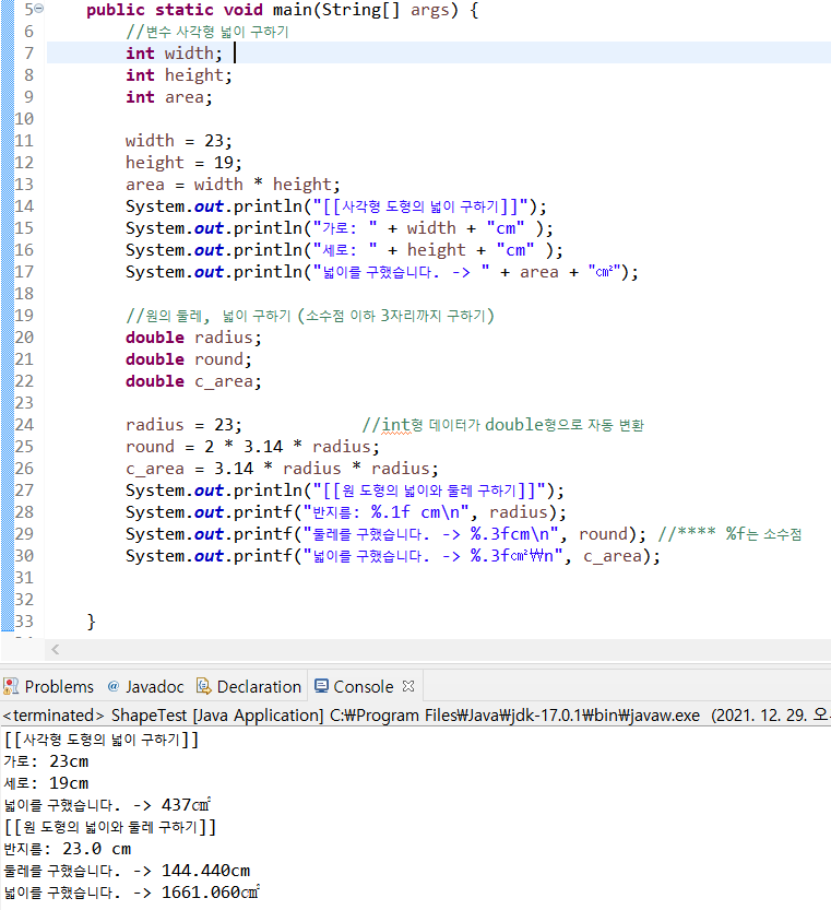 System.out.printf("둘레를 구했습니다. > %.3fcm\n", round); round 값은 %.3f 위치에 출력된다.