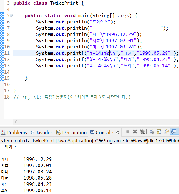 \t: 일정 칸을 띄고 출력