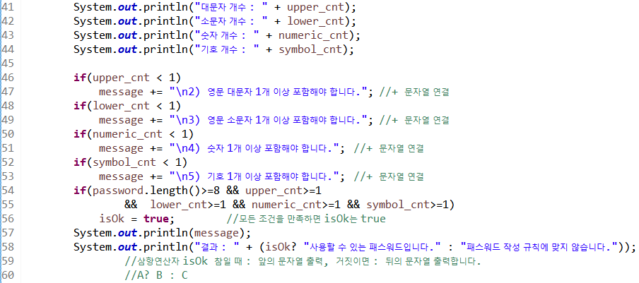 54라인 비밀번호 규칙의 모든 조건을 만족할 경우 논리형 변수 isOk는 true가 된다.