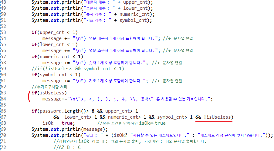67라인 비밀번호 가능 조건들에 && !isUseless를 추가하였다. !isUseless는 true 즉, isUseless가 false여야 괄호 내 조건이 true가 되고 isOk가 true가 된다.