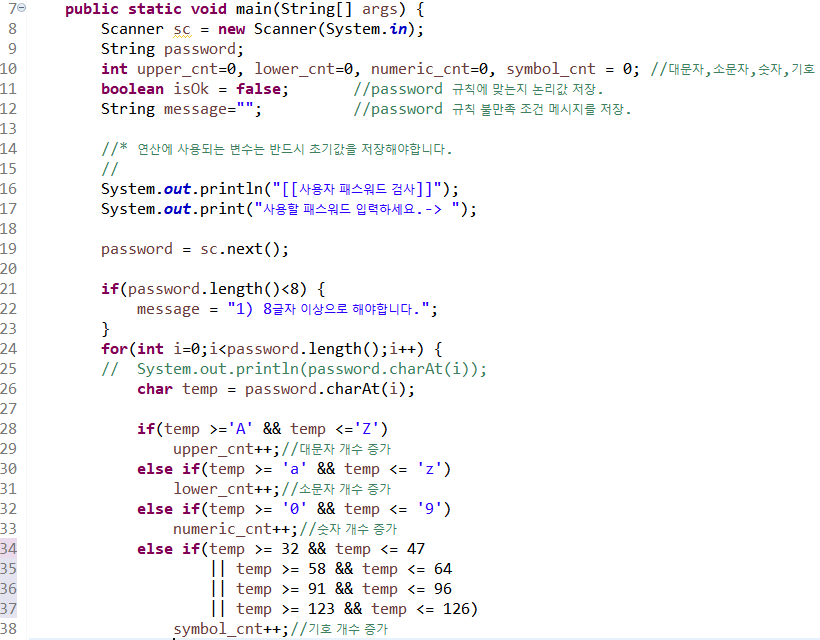28라인 if-else if문을 사용하여 변수 temp에 저장한 문자가 어떤 형식인지(대/소문자, 숫자, 기호)를 검사한다.