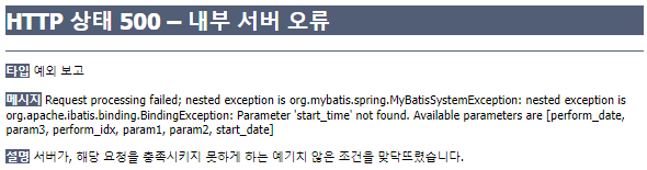 Request processing failed; nested exception is org.mybatis.spring.MyBatisSystemException: nested exception is org.apache.ibatis.binding.BindingException: Parameter 'start_time' not found. Available parameters are [perform_date, param3, perform_idx, param1, param2, start_date]
