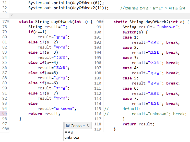 정수값을 전달 받고 1이면 "월요일, 2면 "화요일",....7이면 일요일을 반환하고,