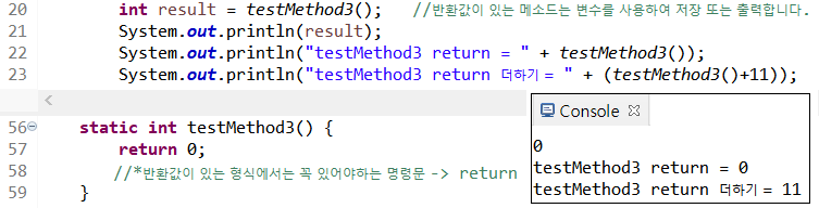 testMethod4처럼 반환값을 변수에 저장하지 않고 바로 출력할 수도 있다.