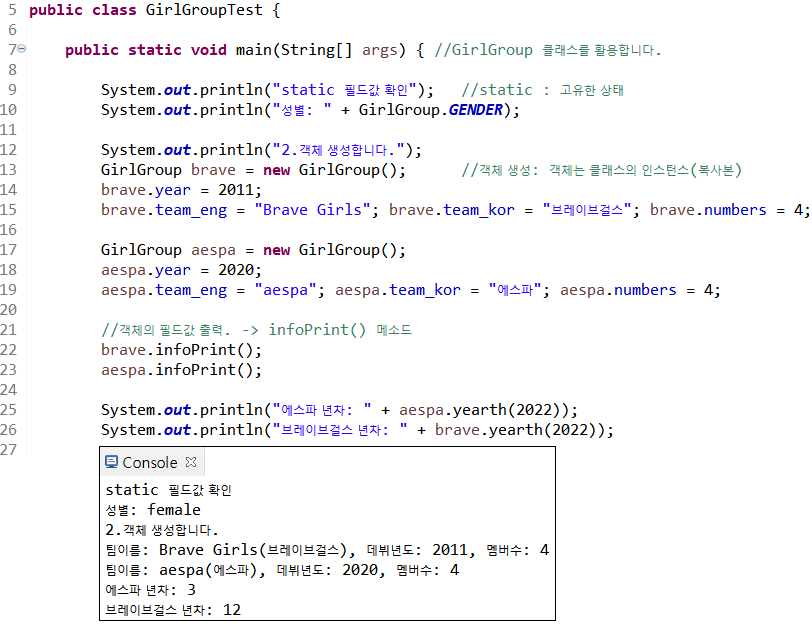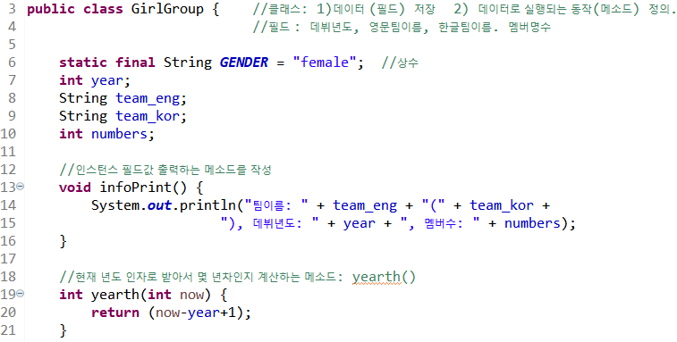 클래스, 필드, 메소드 예제: 걸그룹