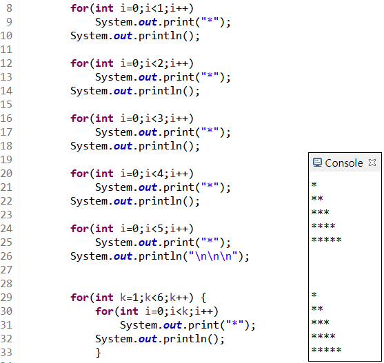 바깥쪽 for문이 한 번 실행할 때마다 중첩 for문은 지정된 횟수만큼 반복해 돌다가 다시 바깥쪽 for문으로 돌아간다.