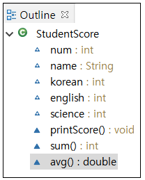 Outline창에서 클래스 내의 필드와 메소드를 확인할 수 있다.