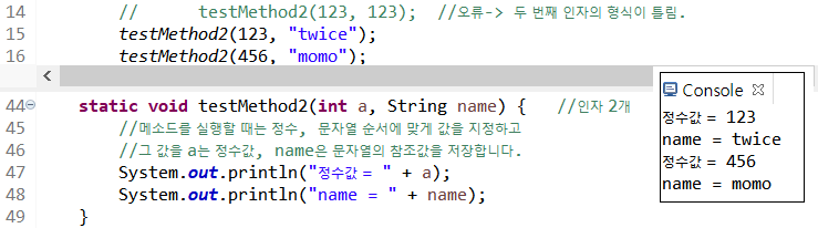 testMethod2(123, 123); 는 두 번째 인자의 형식(String)이 맞지 않아서 오류가 발생했다.